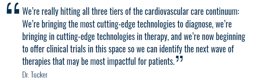 “We’re really hitting all three tiers of the cardiovascular care continuum: We’re bringing the most cutting-edge technologies to diagnose, we’re bringing in cutting-edge technologies in therapy, and we’re now beginning to offer clinical trials in this space so we can identify the next wave of therapies that may be most impactful for patients,” Dr. Tucker outlined. “So, patients can have a true one-stop shop experience in cardiovascular care without having to travel outside our region.”